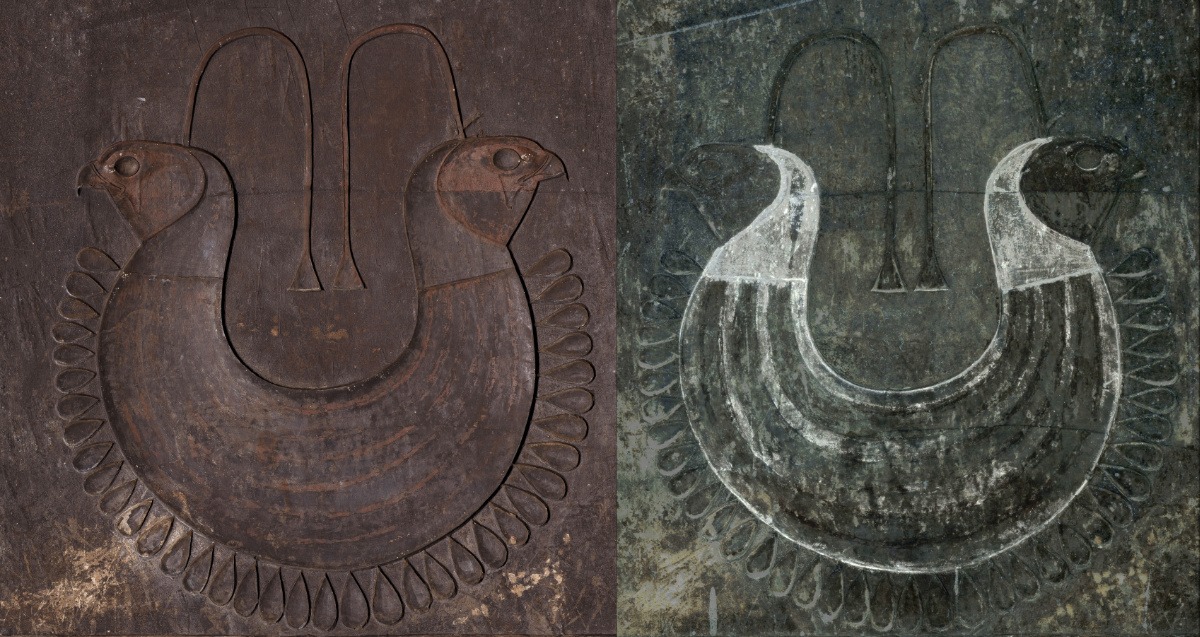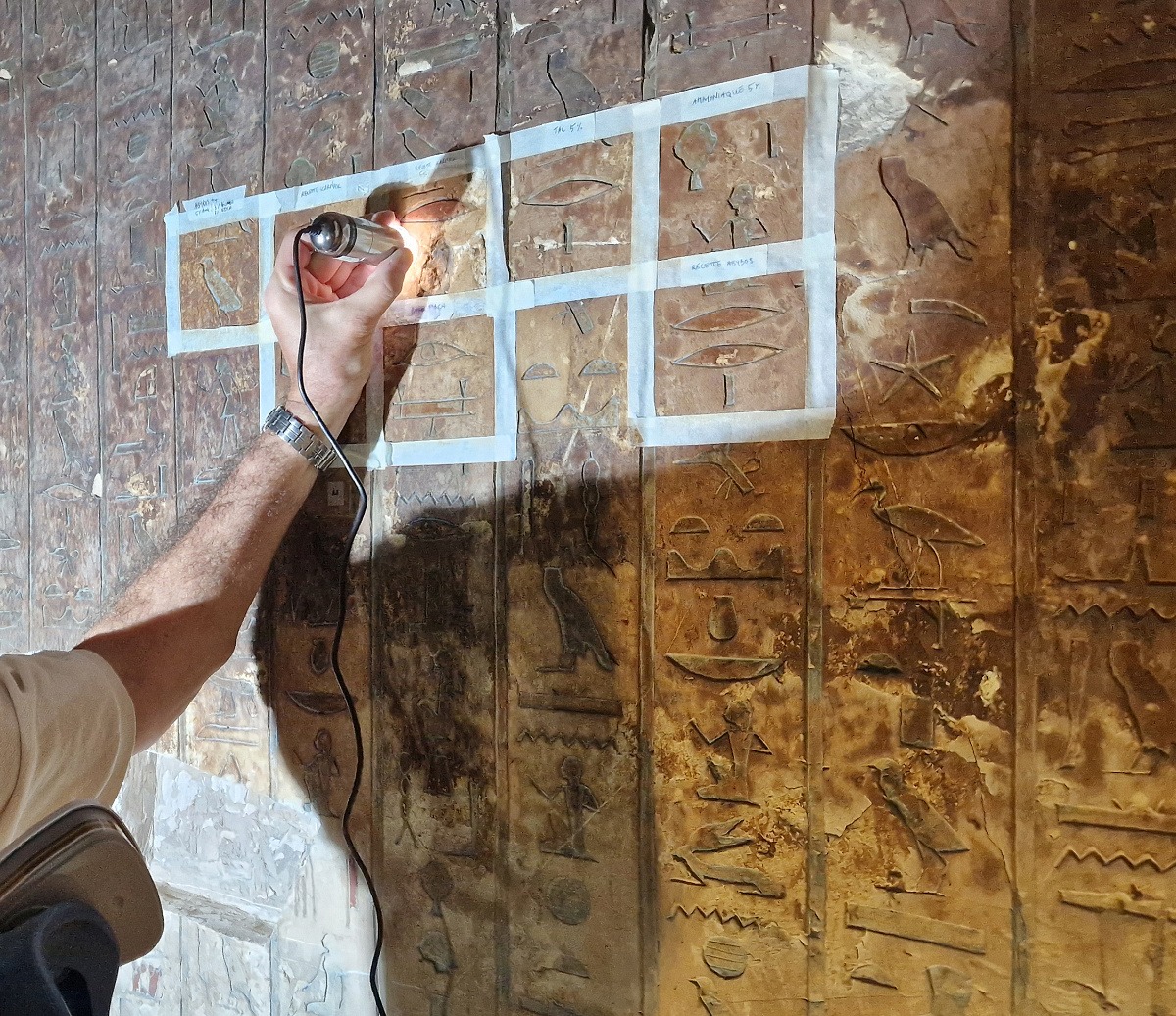 Une campagne photographique a été réalisée pour aider la prise de décision concernant les tests de micro-abrasion et documenter la zone. L’enjeu était également d’évaluer la possibilité de traverser les couches de salissures par l’utilisation de différentes techniques d’imagerie pour retrouver l’emplacement des pigments sur les décors grâce à la comparaison et la combinaison de certaines prises de vues.